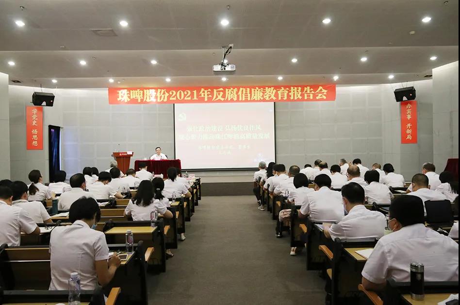 2021年9月9日,珠啤股份召开2021年反腐倡廉教育报告会,邀请广州市纪委监委驻市国资委纪检监察组组长雷兆阳作专题辅导报告。珠啤股份纪委书记、监察专员廖持亮主持会议,党委理论学习中心组成员、高管、珠啤股份及南沙公司各党组织书记、纪检委员、中层以上干部、重点岗位人员、下属企业领导班子成员等约300人参加会议。