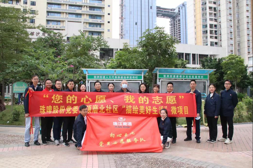 2021年11月23日,珠啤股份党委认领琶洲街道磨碟沙北社区“描绘美好未来”微项目,开展“‘您的心愿、我的志愿’我为群众办实事”主题活动,总部各党组织共15名党员代表参加。
