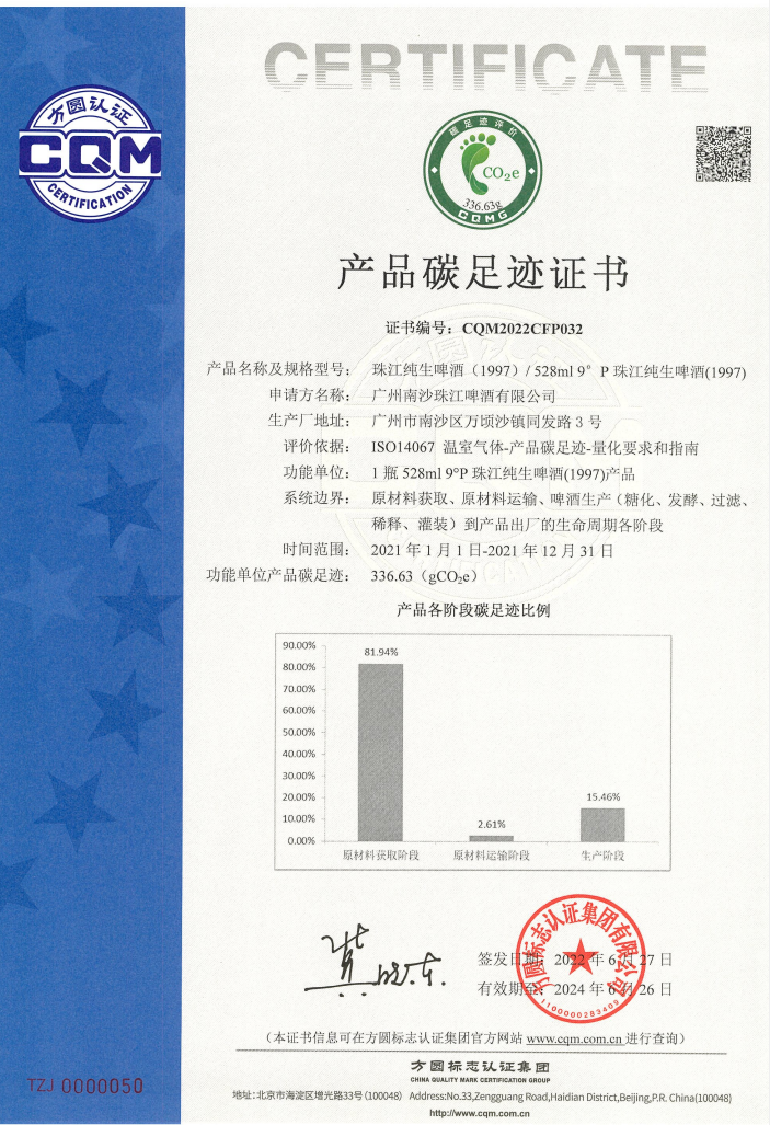 广州南沙TapTap有限公司完成TapTap纯生啤酒(1997)产品碳足迹评价
