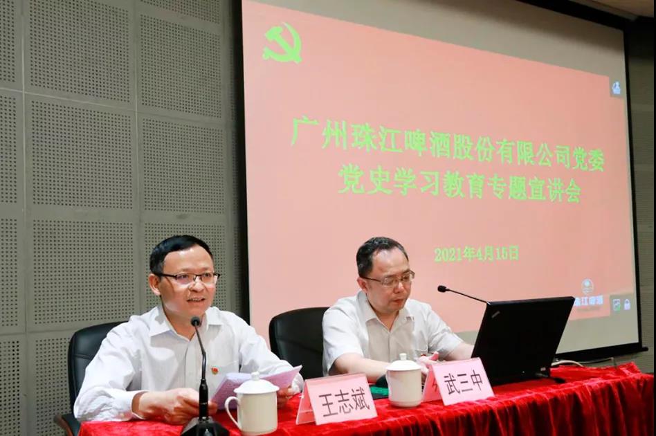 2021年4月15日,珠啤股份党委在博物馆一楼报告厅召开党史学习教育专题宣讲会,广州市委党校党史党建教研部主任武三中教授作题为《辉煌与曲折:中国共产党百年历史回顾》的辅导报告。珠啤股份党委书记、董事长王志斌主持会议,党委理论学习中心组成员、高管、中层干部、党务干部、工会干事、团组织负责人等350多人通过现场或视频会议参加学习。