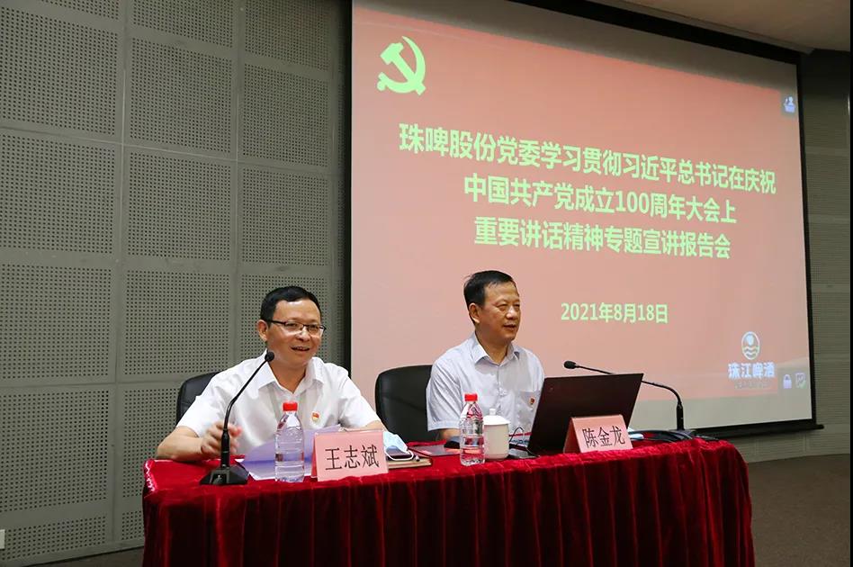 2021年8月18日,珠啤股份党委在博物馆一楼报告厅召开学习贯彻习近平总书记在庆祝中国共产党成立100周年大会上重要讲话精神专题宣讲报告会,市委宣讲团成员、华南师范大学马克思主义学院院长陈金龙教授作题为《读懂中国共产党百年历史的根本遵循——学习习近平总书记“七一”重要讲话精神》的宣讲报告。珠啤股份党委书记、董事长王志斌主持会议,党委理论学习中心组成员、高管、中层干部、党务干部、工会干事、团组织负责人等360多人通过现场或视频会议参加学习。