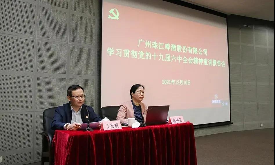 2021年12月10日,珠啤股份党委召开学习贯彻党的十九届六中全会精神宣讲报告会,邀请广州市委宣传部常务副部长,市社科联党组书记、主席曾伟玉作专题辅导报告,珠啤股份党委书记、董事长王志斌主持会议,会议共设主分会场15个,党委理论学习中心组成员、高管、中层干部、党务干部、工会干事、团组织负责人等共350人参加会议。